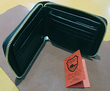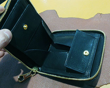特にオススメはジップ付折り財布です(*^o^*) 内装も肉厚なレザーを使い迫力あり!! コイン室がさりげなくカード部分の裏にボックス型に装備されているので中身がスッキリ見えますよね(^^)
