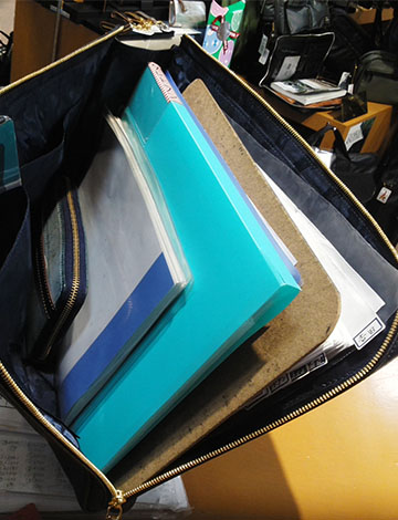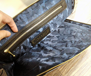 内装はネイビーの大人フラッシュカモで洗練された印象\(^o^)/ 落としポケット2つ、ファスナー1つと小分けする事も可能です(*^^*) ¥28000+税のB4サイズは書類やファイルなど身のまわり品すべてを完結できる要望が多かったサイズです(p_-)