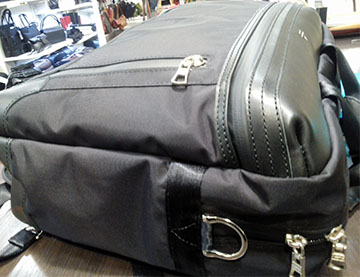 流線型フォルムが特長的なこのバッグはレザー&ジップ&ナイロン全て半永久的に防水です\(^o^)/ レザーの黒は雨にあたると青緑っぽい色に劣化してしまいますが、こいつのレザーはその心配は皆無です(^^)