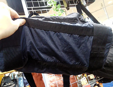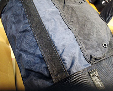 この表情豊かなバッグですが、オールナイロンのファブリックです(ゝω・) 軽量なコーデュラナイロン、強くハリのあるコーデュラナイロン、リップストップナイロンの3素材組み合わせを製品化した後、染めを行います。