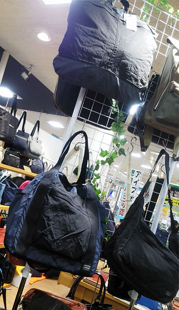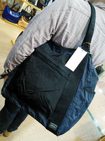 ¥24000+税のトートショルダーバッグは充分な容量で負荷のかかる部分には丈夫なナイロンを配しているので、軽いバッグで底だるみなく使える優れもの(^^)