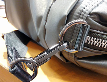 サイド、フロントにスリットポケットが計4カ所あるのは旅先で重宝します(^ー^) ショルダーのナスカン、Dカンは黒ニッケルの部材で大人っぽい印象を高めてますね~v(^o^)