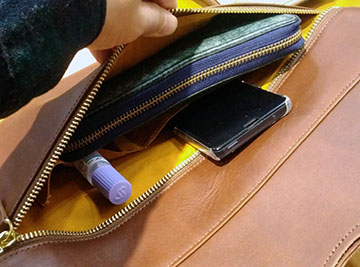 荷物が少ない時は二つ折でスッキリと使用できますね(*^o^*) 背面ファスナーが非常に広いのでお財布・スマホ・鍵・目薬といったクイックに取り出したいものをスムーズに取り出せますよ(´V`)♪