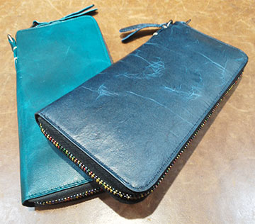 鮮やかなグリーンが人気色としてありましたが、もう少しシックさが加わった印象です☆彡 オイルを入れランダムに焦がしを入れることで他のブルー系のお財布とは違うしゃがれた存在感です(p_-) オススメは¥16000+税のジップ付長財布です(^^)