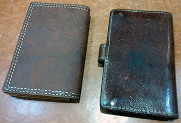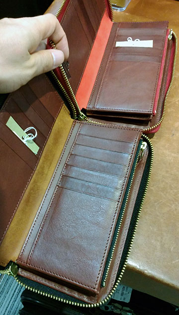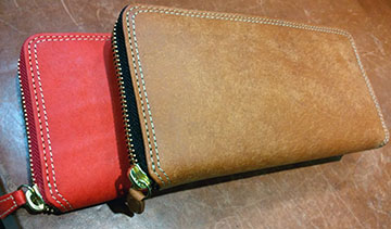 やすりをかけているので使用時の傷もさほど目立ちませんね\(^_^ ) オススメの型ジップ付き長財布¥18000+税は開いてカードがサッと見渡せます(o^^o)