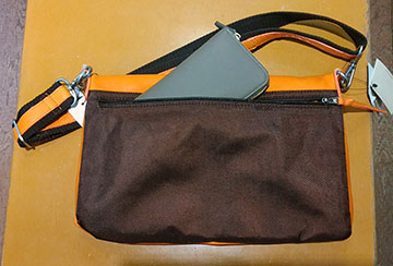 背面は衣服への色移りなどを考慮しナイロン材です(^_^) 背面のファスナー部分が非常に広く、長財布、スマホ、鍵は完結して収納できるスペースがあります(^_^)