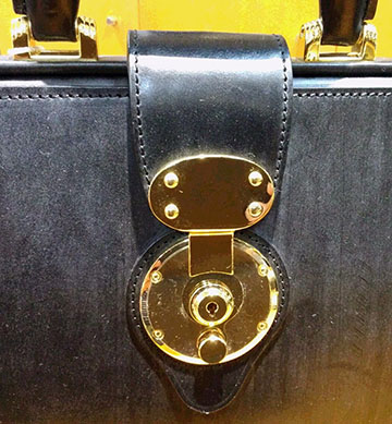品良く輝く、真鍮に金メッキを施した錠前はこのブランドのオリジナルであり、ブランドカタログの表紙にもなっている、まさに顔のバッグ(^ー^)