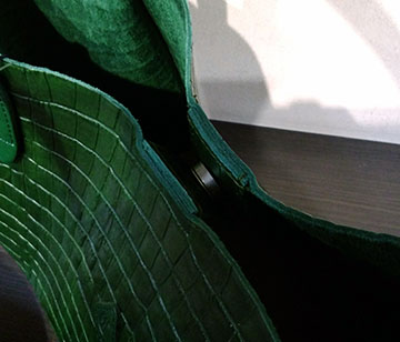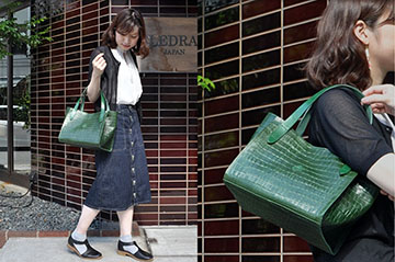 素材をクロコの型押しに変えるだけでなくハンドルの長さを若干伸ばしたり、口元をマグネットにして口元のデザインをスッキリさせたりと全てにおいてキレイめに振ったアモトートです(^_^)ゞ