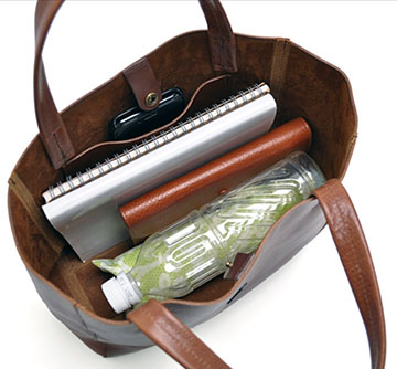 お財布、ポーチ、飲み物がご覧のようにかさばらずに収納できる優等生モデルで、オールレザーの内装ながら内ポケットを一カ所つけているのは嬉しいですね\(^_^ )
