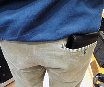 折り財布に求めることと言えばパンツのポケットにインできるかどうかですよね~(^∇^) こちらは重厚なコバ面を強調しつつ極厚オイルレザーにプレスをかけたものなので見た目以上にかさばりません(^^)