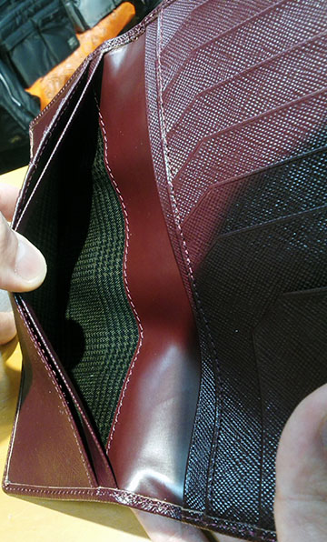サフィアノレザーと呼ばれる弾力性があり傷に強いレザーはインポートのお財布顔負けの端正なお顔(^ー^) これでこの価格はまず驚き(゜Д゜; 内装はカード段が縦並びに13段あり視認性抜群(^^)